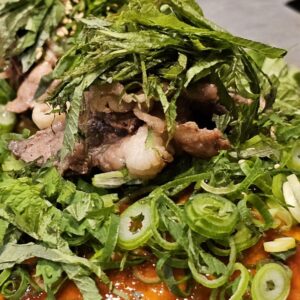 じゃーそれにしようと コウネの乗ったお好み焼き