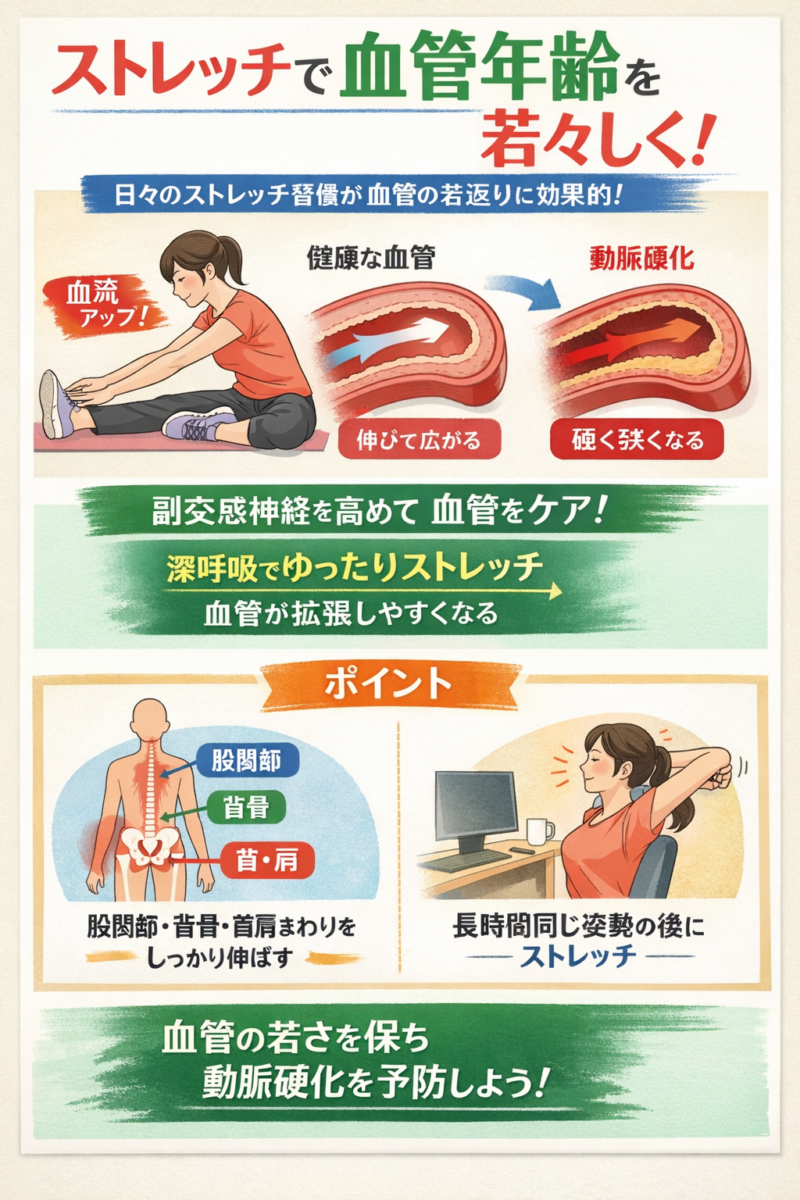 血管の柔軟性が高まり、動脈硬化の予防にもつながります。